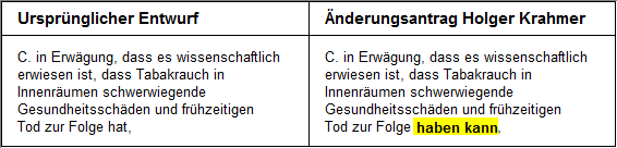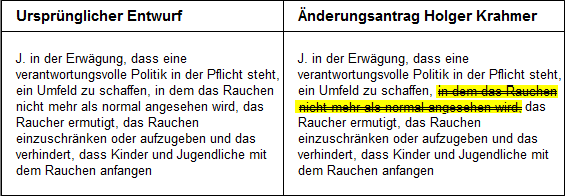 Klar wird in den Dokumenten aber: Der FDP-Politiker liegt mit dem Tabakmulti in wichtigen Punkten auf einer Linie. Krahmer ist gegen ein Verbot von Inhaltsstoffen im Tabak, gegen das Verbot Zigaretten öffentlich zu platzieren und gegen ein Verbot des Kautabaks Snus. Als das Europaparlament vergangenen Februar über die von der Industrie bekämpfte Tabakrichtlinie abstimmte, gab es bei der FDP zwei Gegenstimmen. Eine stammte von Holger Krahmer.