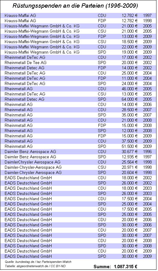 Nun wird aus einer Parteispende allein noch kein erfolgreicher Rüstungsdeal. Politische Entscheidungsträger mögen sich von geostrategischen Überlegungen, Bündnisverpflichtungen oder deutschen Arbeitsplätzen leiten lassen. Doch die Parteispende eines Unternehmens schadet ganz sicher auch nicht bei der Durchsetzung seiner Interessen, denn sonst gäbe es sie nicht. In den vergangenen Jahren allerdings gab es sie reichlich. Nachfolgend eine Auflistung der Spenden, die die größten Rüstungskonzerne in den vergangenen Jahren an CDU, CSU. FDP und SPD überwiesen haben (Quelle: bundestag.de/taz Parteispenden-Watch):
