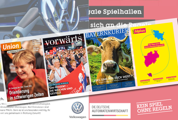 Beim Durchblättern von Parteizeitungen lässt sich mitunter der Eindruck gewinnen, man halte ein Werbemagazin in den Händen. Unternehmen und Verbände wie Volkswagen, E.ON oder die Deutsche Automatenwirtschaft werben bei Parteifunktionären und -mitgliedern für ihre Anliegen. Und das lassen sie sich einiges kosten, wie abgeordnetenwatch.de-Recherchen zeigen. Die teuerste Anzeige in der SPD-Mitgliederzeitung vorwärts kostet zum Beispiel rund 20.000 Euro netto. In der FDP-Zeitung fdplus sind es 10.000 Euro netto.