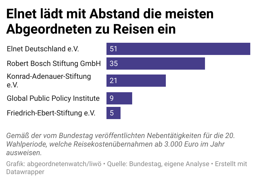 Kostenübernahmen unter 3.000 Euro pro Jahr publiziert der Bundestag nicht. Auch Reisen, die über die Fraktion liefen, sind von der Transparenzpflicht ausgeschlossen. Einzelne Abgeordnete teilten abgeordnetenwatch mit, zumindest einen Teil der Reise selbst bezahlt zu haben. Die vollständig von Elnet bezahlten Trips ihrer Kolleg:innen wollten sie nicht kommentieren.