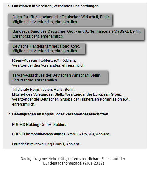 Zwar sind die jahrelang nicht gemeldeten Nebentätigkeiten nach Angaben von Fuchs allesamt ehrenamtlich. Umso mehr fragt man sich, warum er sie entgegen der Richtlinien nicht beim Bundestagspräsidenten gemeldet hat. Auffallend ist, dass Fuchs seine Vorstandstätigkeit in der German Chamber of Commerce in Hongkong eher diskret behandelt. Auf seiner persönlichen Homepage führt er im "Lebenslauf (lang)" (Stand 17.1.2012) detailliert seine früheren und derzeitigen Funktionen auf - vom Amt des Bundesvorsitzenden des Bundesverbandes Junge Unternehmer bis zur Vizepräsidentschaft bei der Federation of European Wholesale and International Trade Associations. Auch der Asien-Pazifik-Ausschuss und der Taiwan-Ausschuss finden Erwähnung. Nicht aber die Mitgliedschaft im GCC-Vorstand Hongkong.