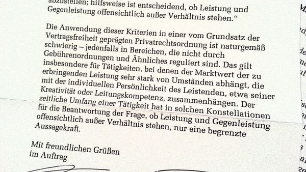 Immerhin hält das Schreiben gegen Ende dann doch noch eine brauchbare Information parat. Mitunter, so der Regierungsdirektor, sei der zeitliche Umfang einer Nebentätigkeit auch gar nicht besonders aussagekräftig. Zum Beispiel dann, wenn  der "Marktwert der zu erbringenden Leistung sehr stark von Umständen abhängt, die mit der individuellen Persönlichkeit des Leistenden, etwa seiner Kreativität oder Leitungskompetenz, zusammenhängen".