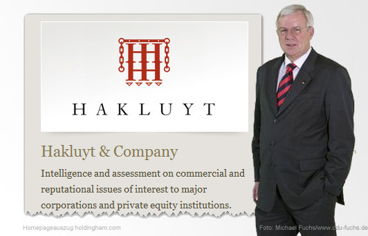 Über die Geschäftstätigkeit von "Hakluyt & Company" (H&C) ist nicht allzu viel bekannt - aber immerhin so viel: Die Londoner Firma betreibt Informationsbeschaffung für Großunternehmen und Private Equity Gesellschaften ("Heuschrecken"), ist also so etwas wie ein privater Nachrichtendienst für Big Business. Zahlreiche Unternehmen des britischen Aktienindexes FTSE 100 und weitere internationale Großkonzerne sollen zum Kundenkreis von H&C gehören.