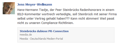Der als Journalist getarnte Agenturchef Tiedje verteidigt seinen Klienten Steinbrück. Ein Hinweis auf diese Geschäftsbeziehung wäre reizend gewesen, BILD! Von wegen Transparenz und so...