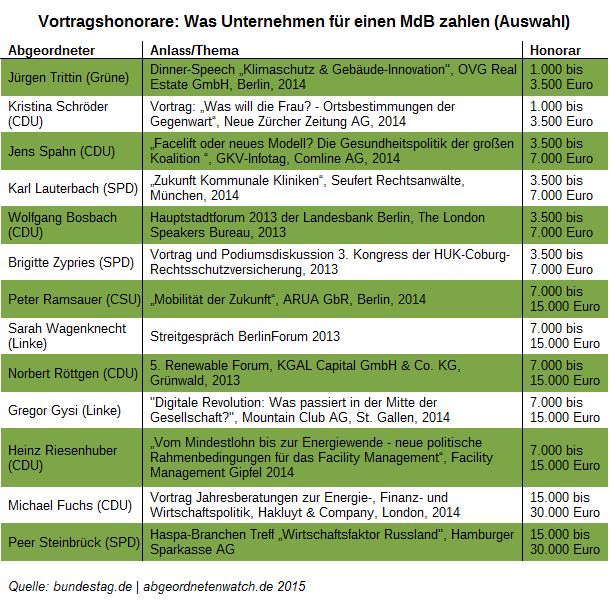 "Wie soll vernünftig Korruption bekämpft werden, wenn ein Unternehmen einem Abgeordneten für ein launiges Grußwort ein paar Tausend Euro zahlen kann?" fragte 2013 der damalige Geschäftsführer von Transparency International Deutschland, Christian Humborg. Im selben Jahr war zum Beispiel bekannt geworden, dass die internationale Wirtschaftskanzlei Freshfields dem SPD-Politiker Steinbrück 2011 für einen Vortrag 15.000 Euro Honorar gezahlt hatte. Pikant war dabei, dass Freshfields während Steinbrücks Amtszeit als Bundesfinanzminister mehrere Berateraufträge im Zusammenhang mit der Eurorettung in Höhe von 1,8 Mio. Euro erhalten hatte.