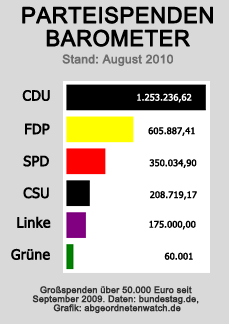 • Erhaltene Gesamtspenden der Parteien seit September 2009 ("Parteispenden-Barometer") sowie Spendensumme nach Parteien: eigene Berechnung