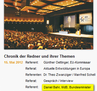 Update 14.6.2012: Am 15. Mai fand die diesjährige Hauptversammlung des Bundesverbandes Deutscher Unternehmensberater statt, ein Berufsverband aus dem DVAG-Umfeld. Einer der Hauptredner beim Jahrestreffen des Großspenders von CDU und FDP (2010/11: insg. 172.100 Euro):